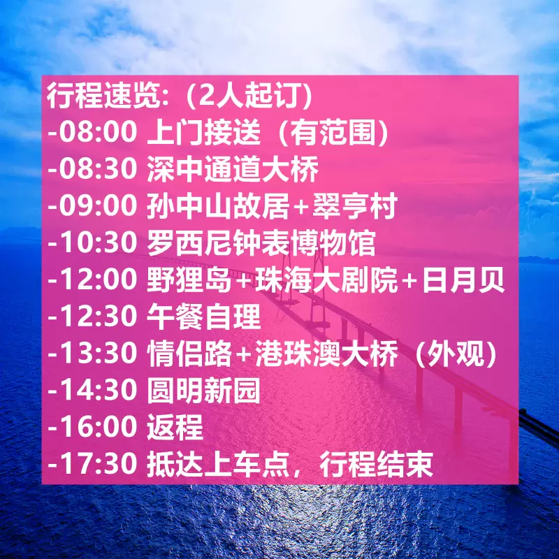 珠海圆明新园+野狸岛+情侣路+日月贝歌剧院+孙中山故里旅游区+罗西尼钟表博物馆+深中大桥+港珠澳大桥游一日游