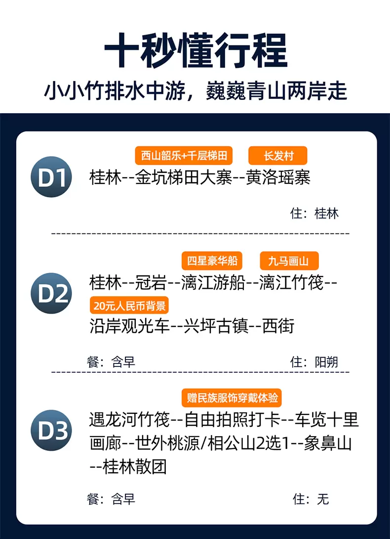 桂林阳朔+龙脊梯田+象鼻山景区+遇龙河景区三日游【8人·佳游纯玩~民族服饰体验|四星船+漓江竹筏+20元背景】