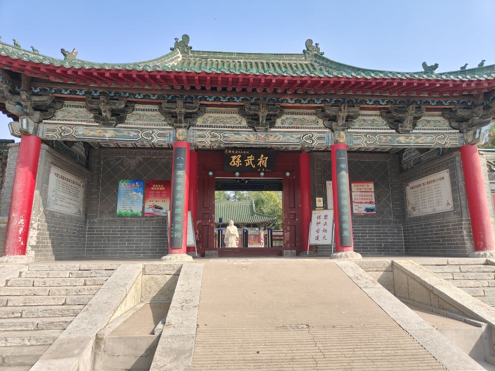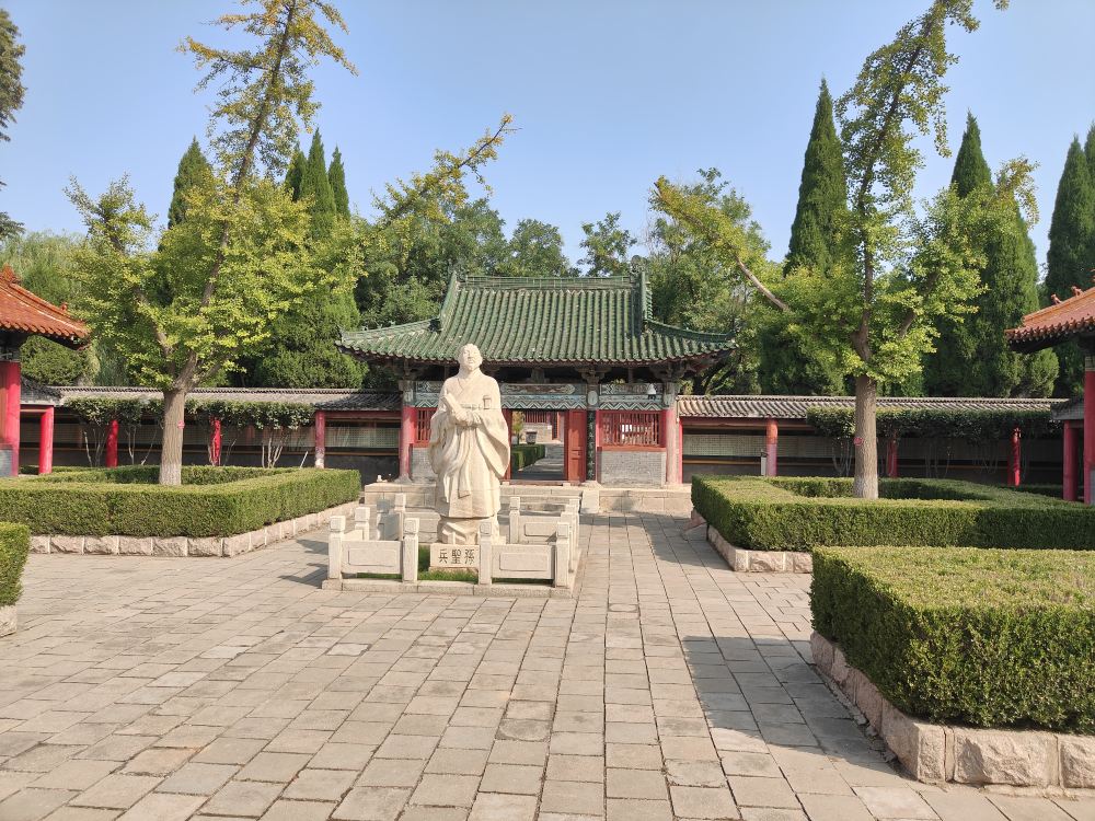 孙武祠前院正中是一尊孙武汉白玉石雕像,该像是由青岛工艺美术学院谭国信教授创意制作的,像高3.2米,孙武手持兵书,腰挎宝剑,睿目远眺,俨然一位运筹帷幄的将军正在指挥千军万马鏖战沙场。