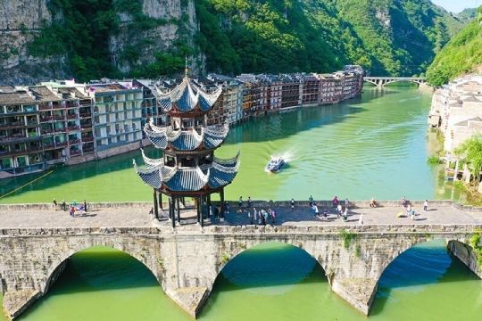 ▲ - 舞阳河淌成星河,吊脚楼的灯火在波心晕染成诗。 - 青龙洞悬于夜色,灯光勾勒出绝壁上的空中宫阙。 - 祝圣桥连两岸灯火,一步踏过千年的流光溢彩。 - 青石板路映暖灯,晚风裹着夜市香气漫过古巷 。 - 游船划破灯影,分不清是船在画中游,还是人在梦里行。 - 石屏山守着一城灯火,太极城的轮廓在夜色中渐次清晰。 - 红灯笼串起长街,古建与光影在河面织就流动画卷。 - 无人机点亮夜空,传统古寨与现代光影共赴浪漫之约。