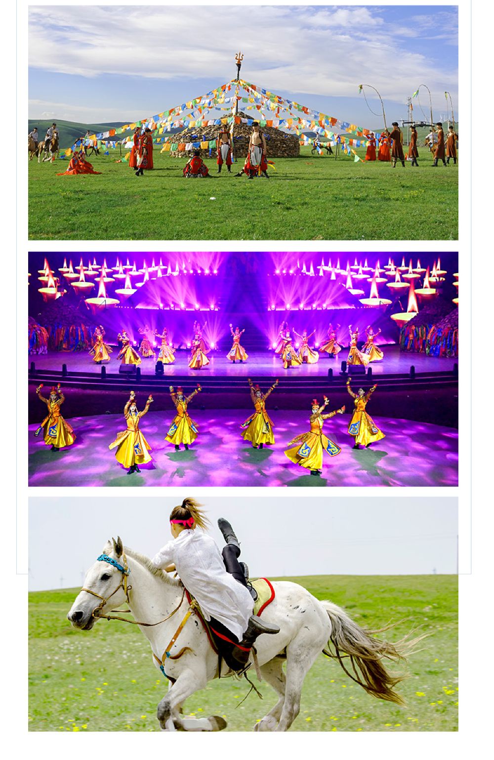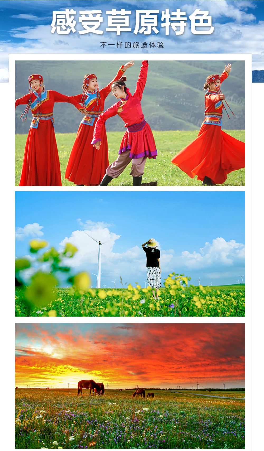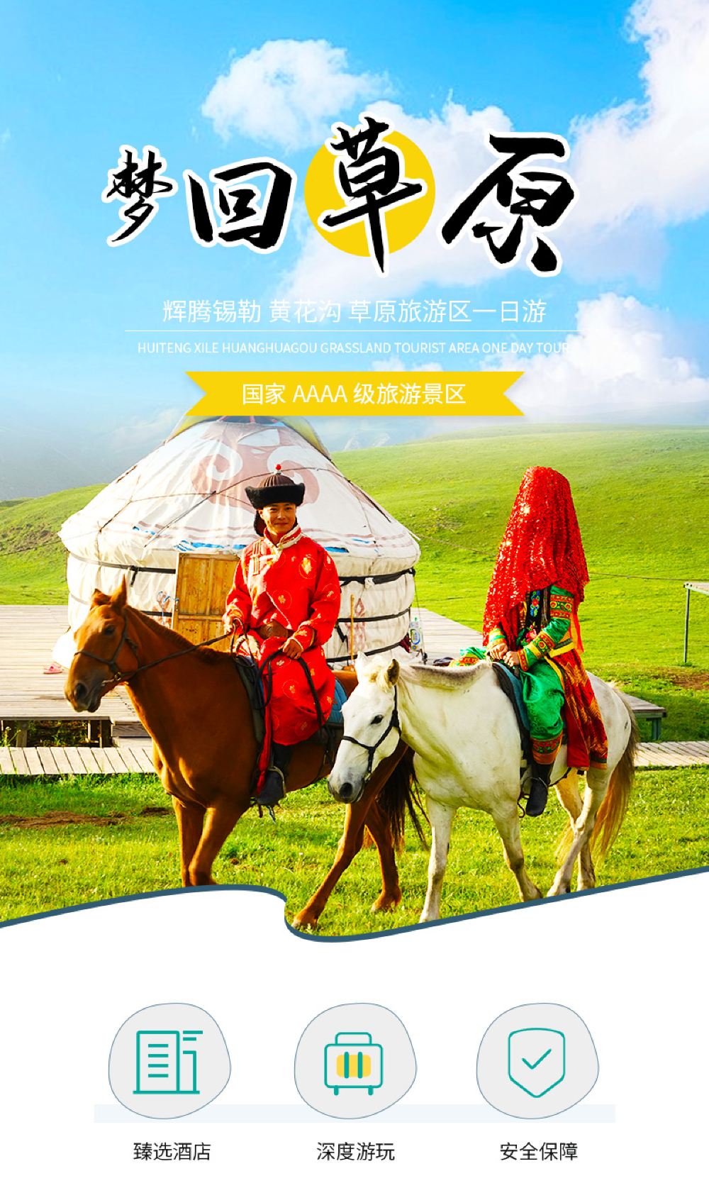 呼和浩特是内蒙古首府,从这里出发首先需要您提前1天落地呼和浩特住宿休息一晚,晚上可以自由溜达,例如大召寺、清真寺、五塔寺、中山路海亮广场等,品尝美食有烧麦、羊杂、涮肉、冰煮羊、烤肉等。第二天清早7:30左右可以乘车前往辉腾锡勒草原路程约120公里用时近1.5小时,方位在呼和浩特东面卓资县与察哈尔右翼中旗交界处,属高山类草原,海拔近2000、常年风大、日照强、草地覆盖面广、还有亚洲出名的风力发电点缀着草原,黄花沟便是辉腾锡勒草原上的其中一个景点,这里有正规的马场可以同时供应上千人骑马驰骋草原、也有直升飞机空中俯瞰草原等娱乐项目,成片成千的蒙古包是草原上耀眼的名片,辉腾锡勒是距离首都较近且保护较好的理想的游玩避暑之地。草原上还有美味的餐食基本都在蒙古包里进行,可以跟着靠谱的司导选择一家靠谱的餐厅用餐,下午返程呼和浩特大约在17:00多用时1个小时多点,到达呼和浩特是18:30左右,这里特别提醒跟团或者包车一定要选择正规的旅行社或者司机,安全第一!晚上有回北京的高铁可以直达清河站结束一天的草原之旅。