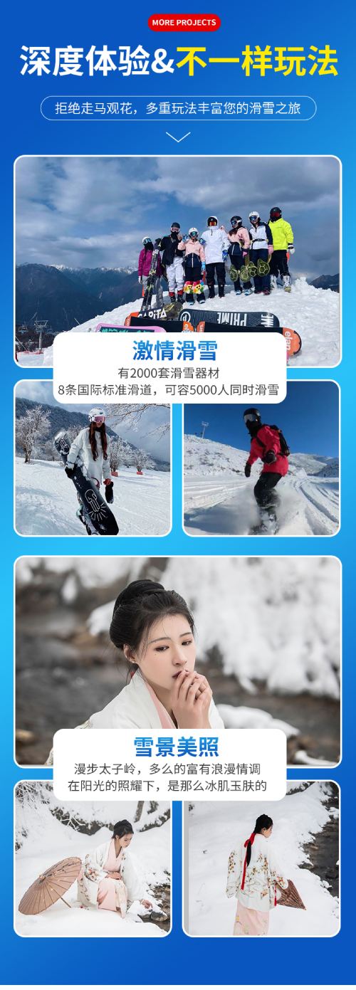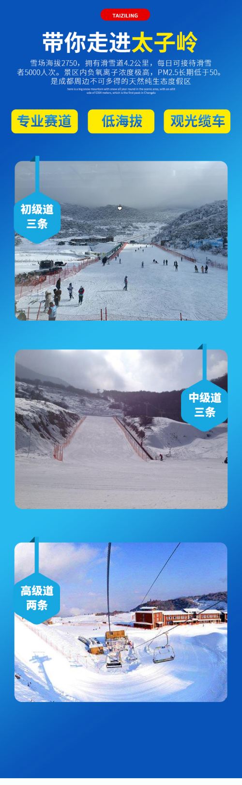 太子岭滑雪场现设11条雪道,包括3条初级道、3条中级道和3条高级道,总长4.2公里,最长雪道达1.7公里,垂直落差238米;索道系统配备1条四坐吊椅索道和11条魔毯,日接待能力为5000人次。雪场还提供戏雪区、雪具租赁、专业教练服务及多种冰雪娱乐项目。
