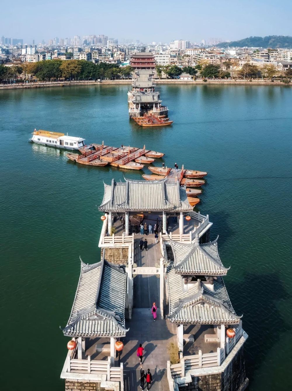 ▲ 湘子桥又称广济桥,位于广东省潮州市古城东门外,横跨韩江,是中国四大名桥之一。 白天,湘子桥闭合,游客可以在桥上欣赏木雕、潮绣、泥塑等非遗手工艺作品。夜晚,古桥灯火通明,与江水相映生辉,景色十分迷人。而在雨天,湘子桥还能发挥排涝功能,展现出古人的智慧。
