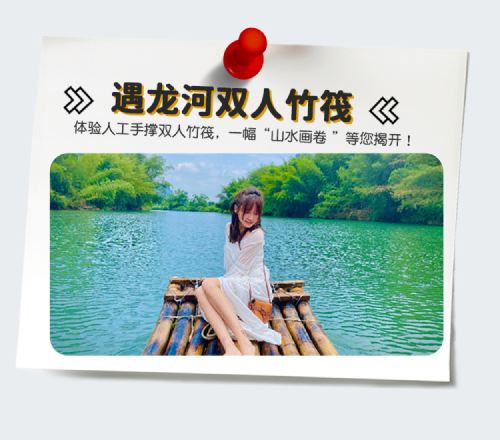 3、关于空位:遇龙河双人竹筏为人工竹筏,可乘坐2名游客,2人起发筏,如您是单数出行,我们会优先为您与其他团友拼筏,如无法拼筏则需要补筏差100元/人,敬请提前知晓。