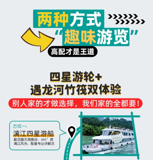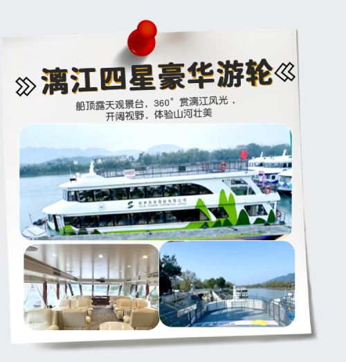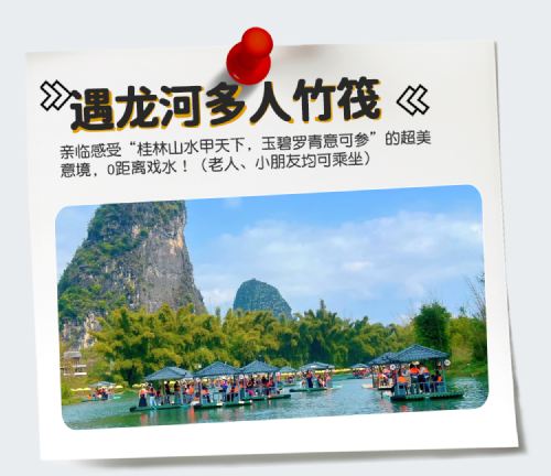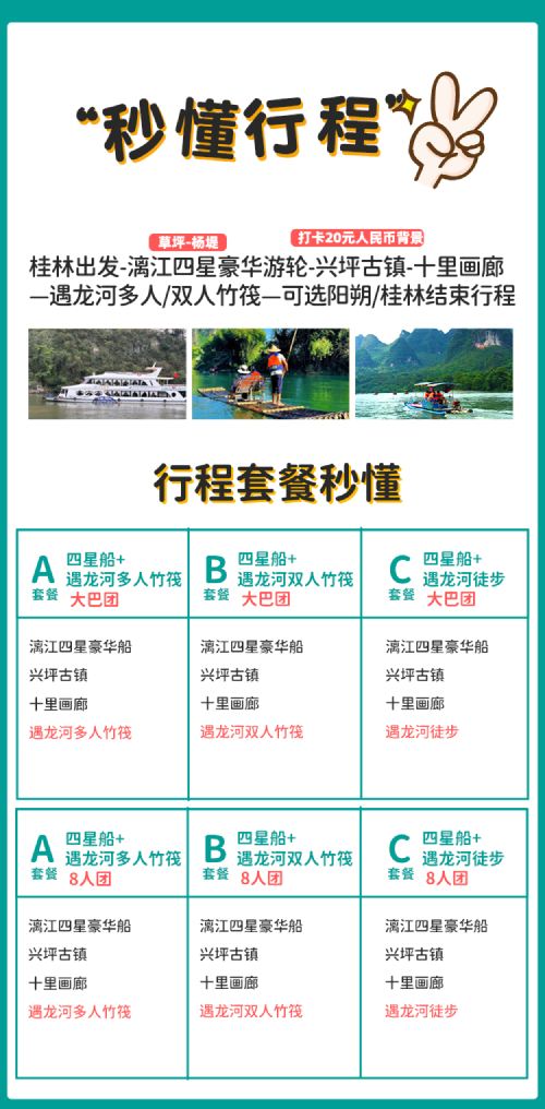 套餐A:漓江四星游轮 + 兴坪古镇 + 打卡20元背景图 + 遇龙河8人竹筏漂流 + 十里画廊;