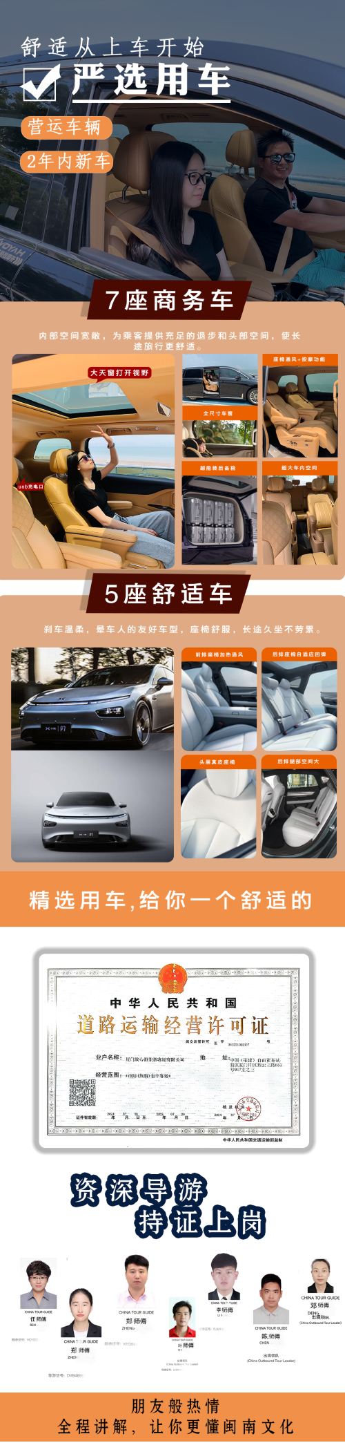 根据出行人数安排对应车辆,所有车辆保证干净舒适,有正规营运资质。