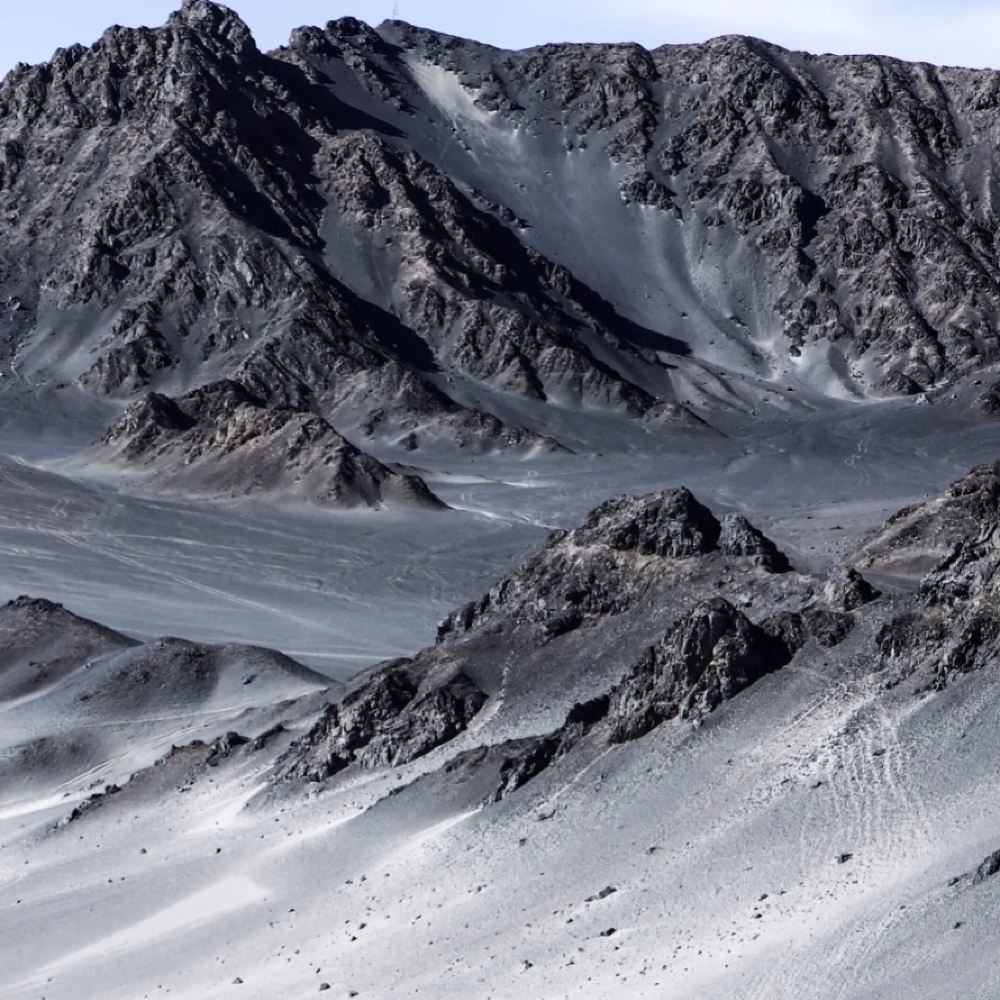 ▲ 黑独山的山体呈灰黑色,与山下的白沙相互映衬,构成了自然天成的黑白系“水墨画”世界。从远处眺望,黑独山巍峨绵长,赤裸的石山色彩斑驳,恰似一幅年久褪色的古老画卷。