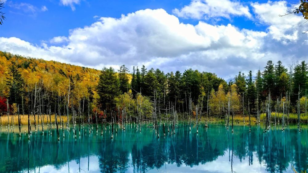 ▲ 青池 青池位于北海道美瑛川左岸,因拦截火山岩浆修建的水坝截流而成,在阳光下,池水会反映出蓝色,故而得名。走近美瑛青池,如同走入了仙境,一副云雾缭绕的朦胧美,素有日本”小九寨沟“之称。每当清晨到来,水色更佳纯净碧蓝,美不胜收。