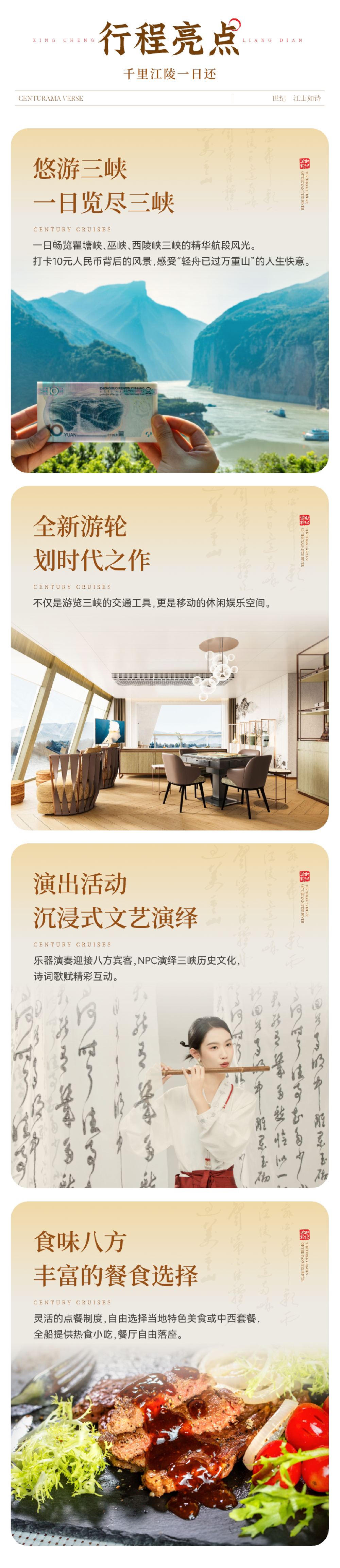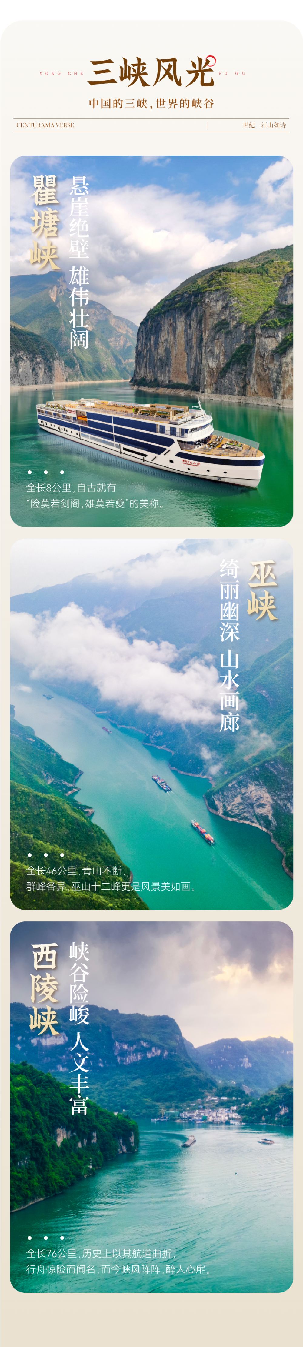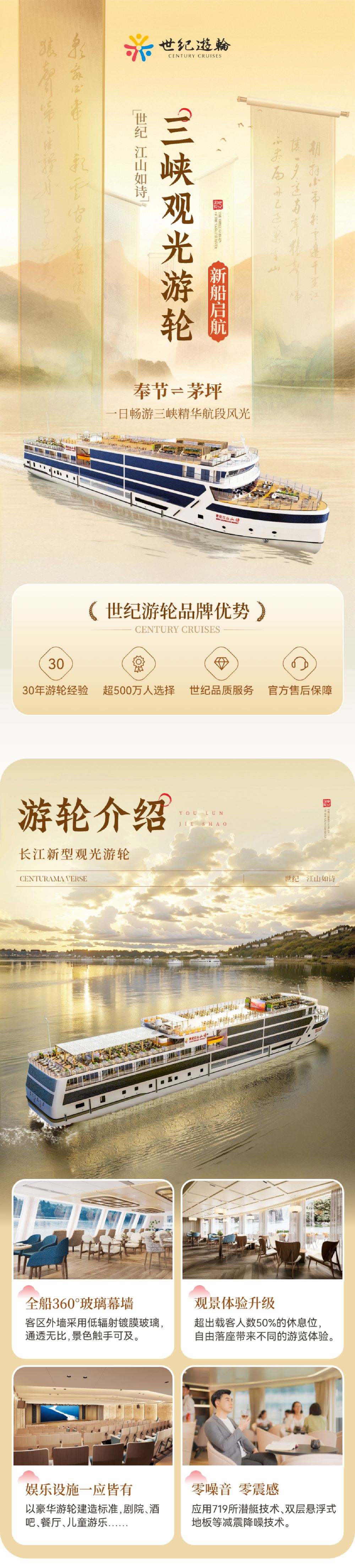 瞿塘峡+巫峡+西陵峡风景区一日游/世纪江山如诗-三峡观光游轮【世纪江山如诗以豪华游轮建造标准,集餐饮、娱乐、文 化、休闲为一体,多维度提升游客短途观光的游览体验。】