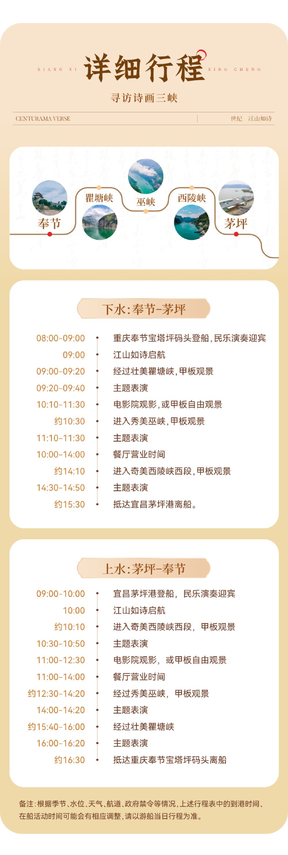 根据季节、水位、天气、航道、政府禁令等情况,上述行程表中的到港时间、在船活动时间可能会有相应调整,请以游船当日行程为准。