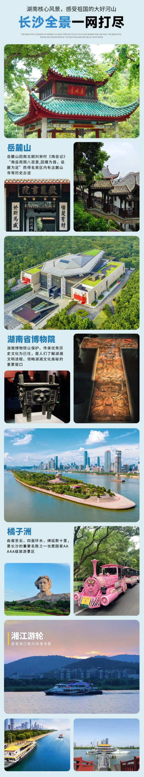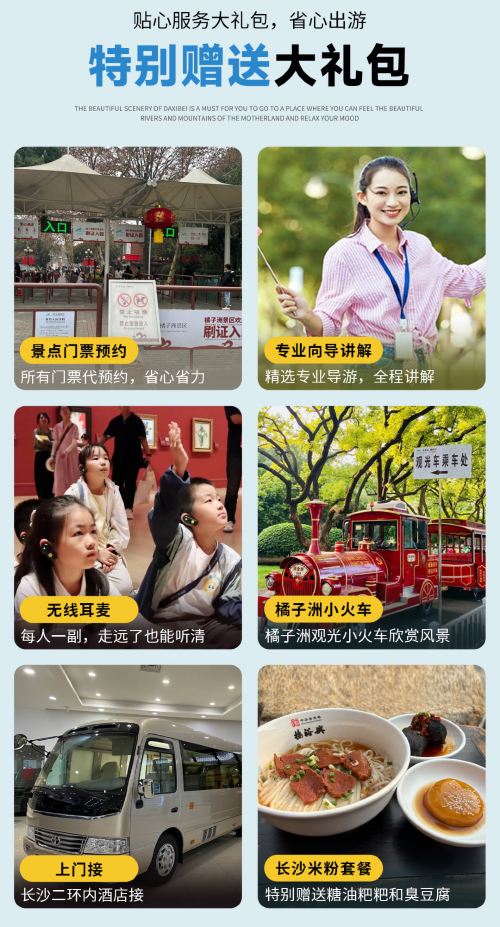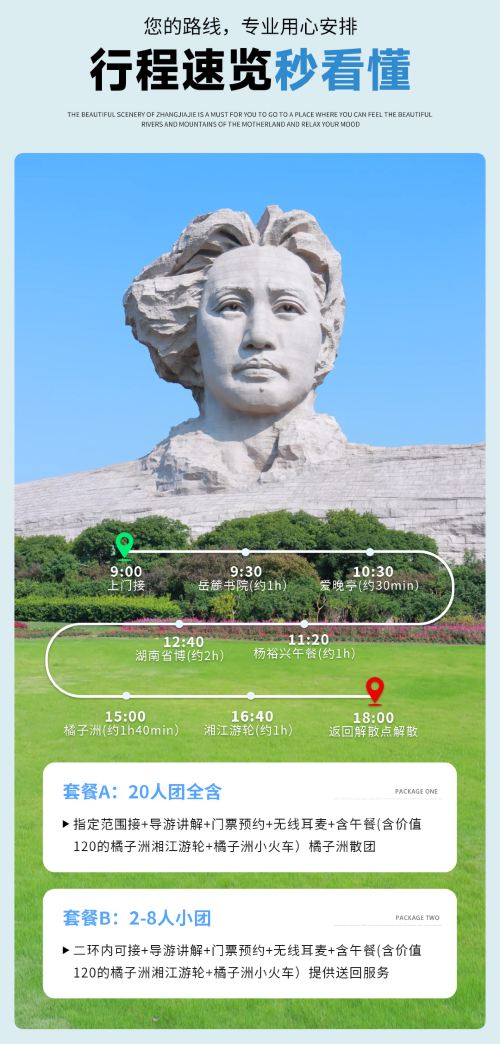 ①套餐A——20人团|行程用车+导游讲解+门票预约+无线耳麦+(含午餐+含价值120的橘子洲湘江游轮日游+橘子洲小火车+长沙特色小吃套餐);