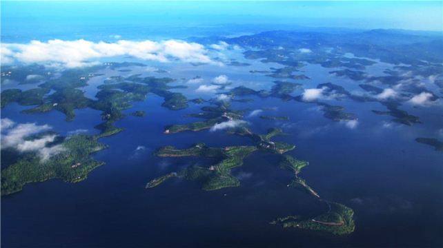▲ 长寿湖风光旖旎,湖岛相映成趣。湖区拥有岛屿203个,神奇的是湖中心的“天赐寿岛”,由19个岛屿组成一个魏碑体“寿”字,神䪨天成、天赐长“寿”。游客可搭乘观光系留气球,于百余米空中沉浸式观赏寿岛之壮丽。