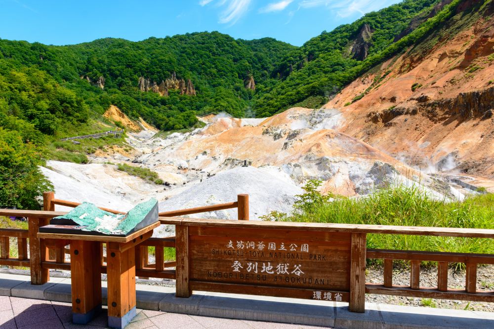 登别地狱谷,火山口遗迹,火山爆发后由融岩所形成的一个奇形诡异的谷地;灰白和褐色的岩层加上许多地热自地底喷出,形成特殊的火山地形景观。