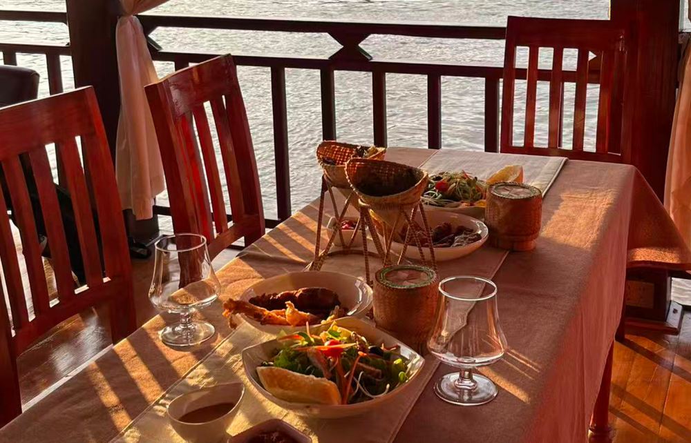 ▲ 老挝特色晚餐1份, 甜点和啤酒1份, 品味地道老挝佳肴,佐以落日余晖。船在画中行,美食与美景共醉,交织成难忘的感官盛宴。 游船结束后,就地解散,游客可自行逛当地出名的夜市码头