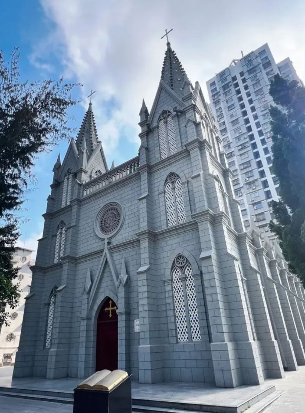 开篇闯入 “广州湾维多尔天主教堂” 的哥特式秘境,24 米双尖石塔刺破苍穹,七彩琉璃窗在晨光中流转光斑。穿浅色系衣物站在鹅卵石步道拍全景,尖顶与蓝天同框自带法式滤镜,教堂内保持安静可感受百年宗教氛围。