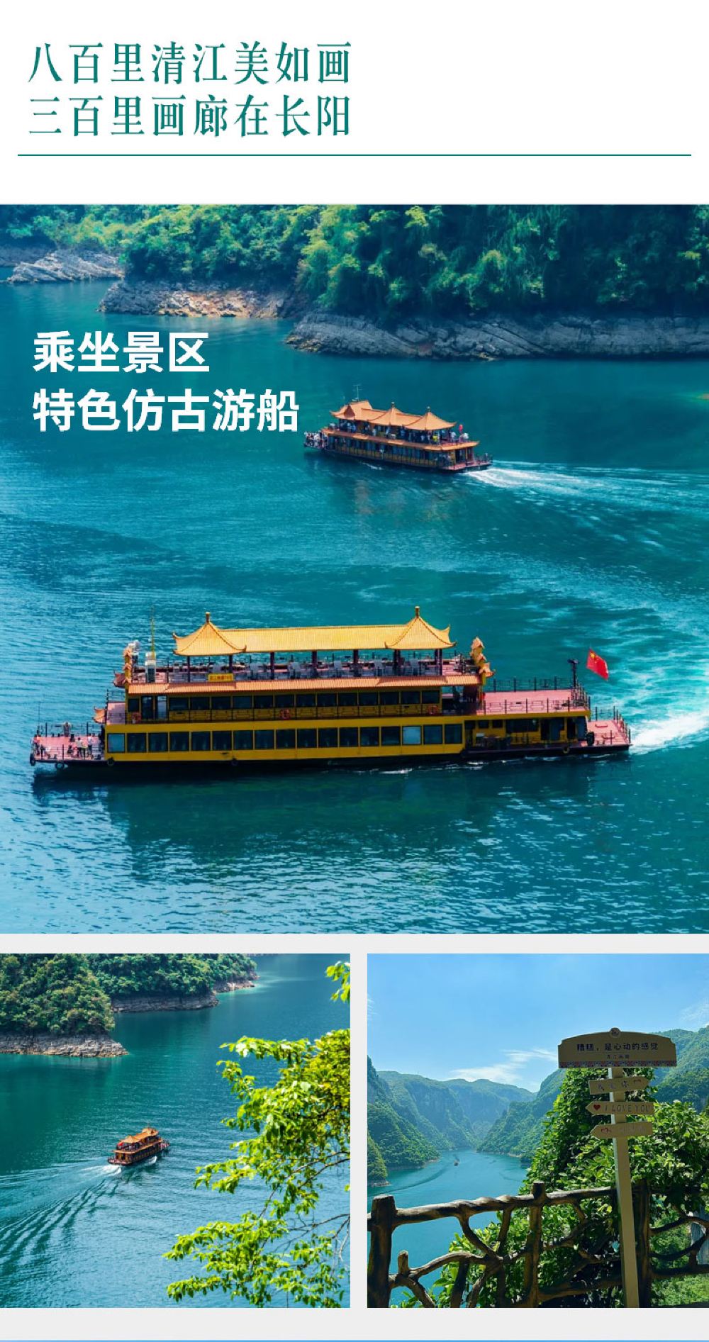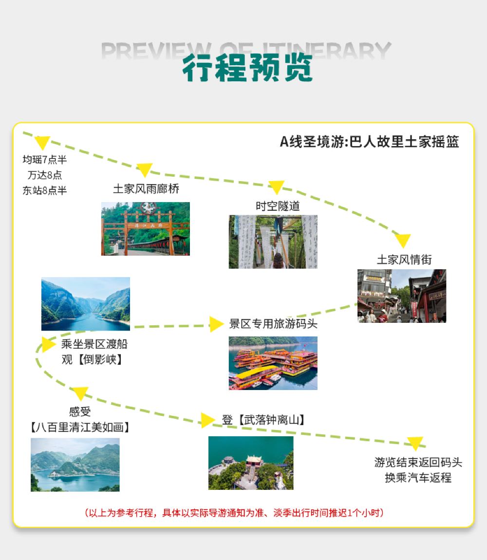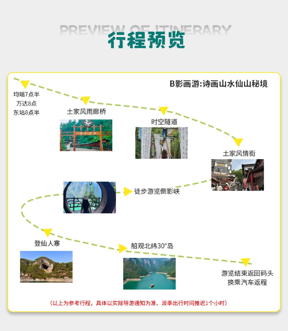 游览线路线路:土家风雨廊桥--时空隧道--土家风情街--徒步游览倒影峡(沿途参观贺新郎、灵运道、燕归来,霞客道、登云梯等多处景点)-船仙人寨--船观北纬30°岛-乘船返回旅游码头