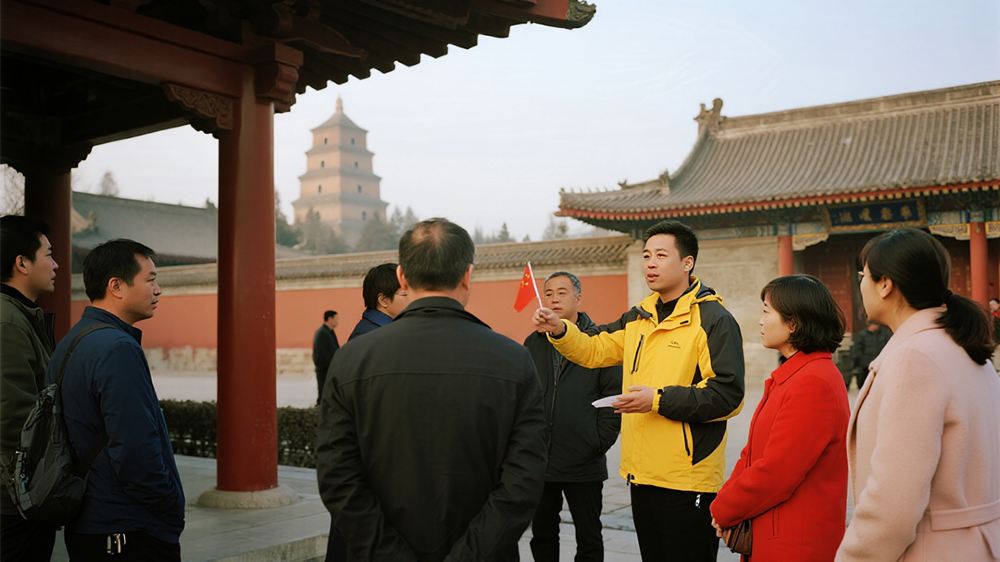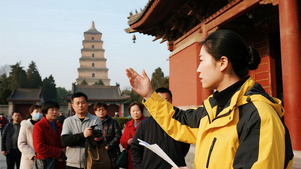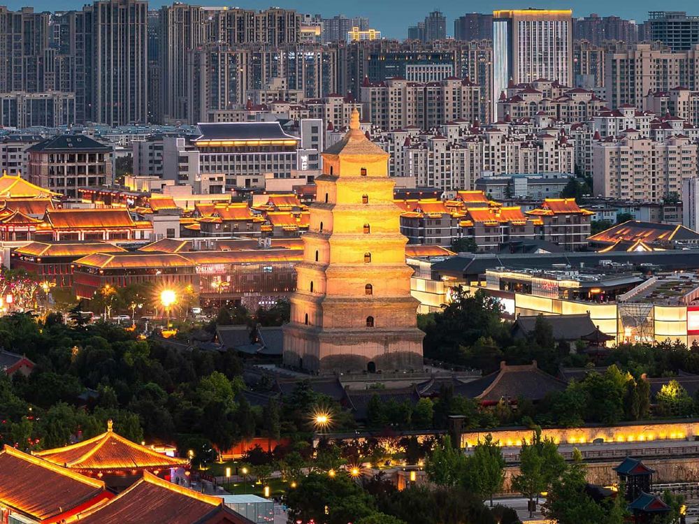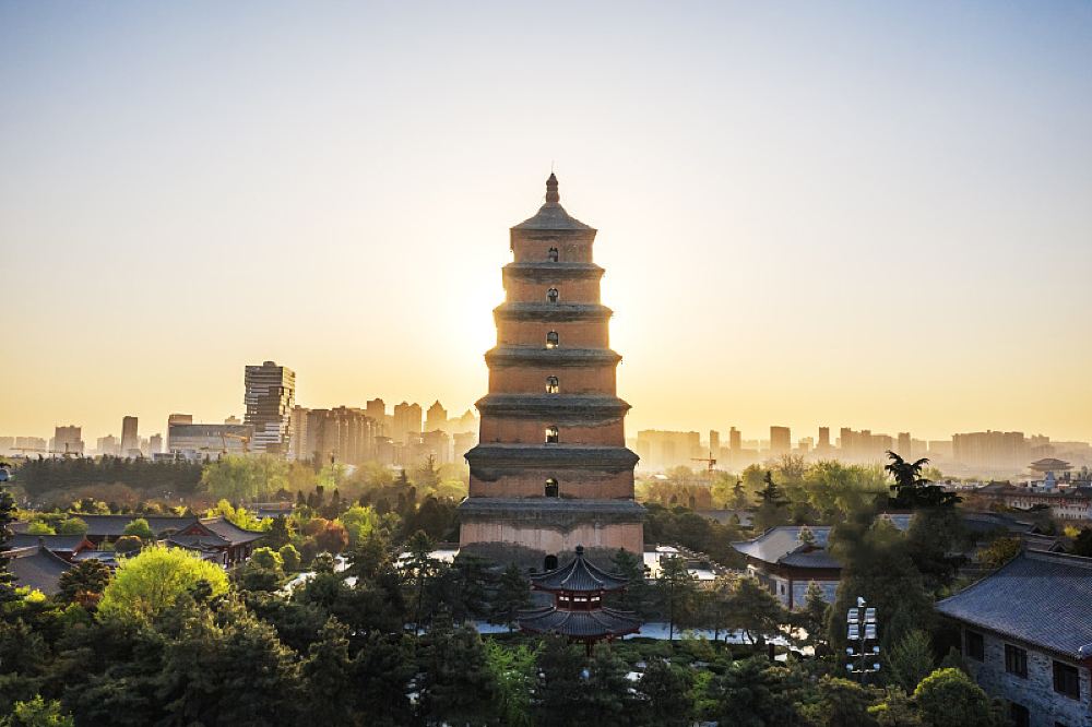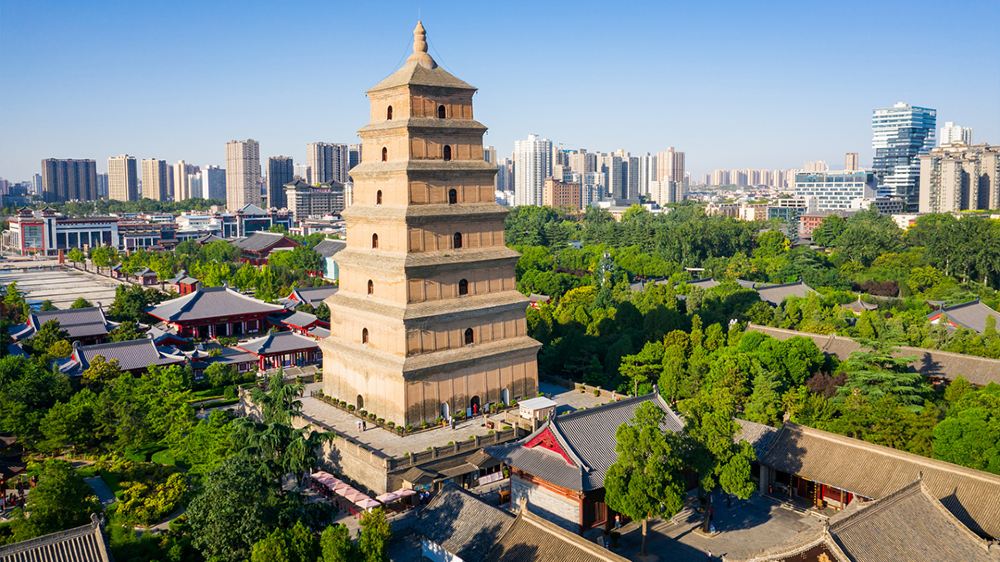 ▲ 西安城中,大雁塔巍然矗立,青砖古塔耸云端,檐角风铃摇曳,与周边仿唐建筑群相映,尽显千年古都地标风范与历史底蕴。