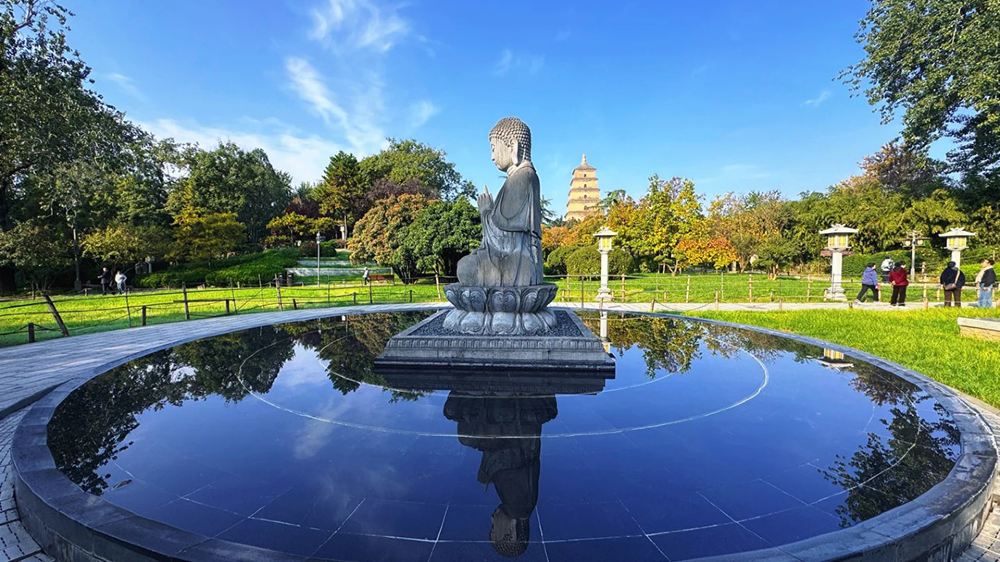 ▲ 阳光下大雁塔巍峨矗立,青砖古朴,塔檐舒展,尽显千年古都沉稳厚重底蕴。