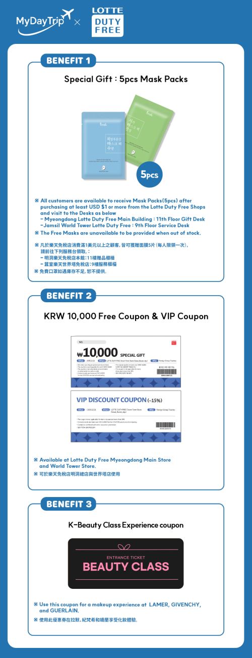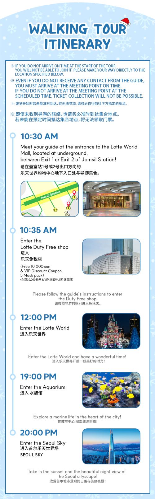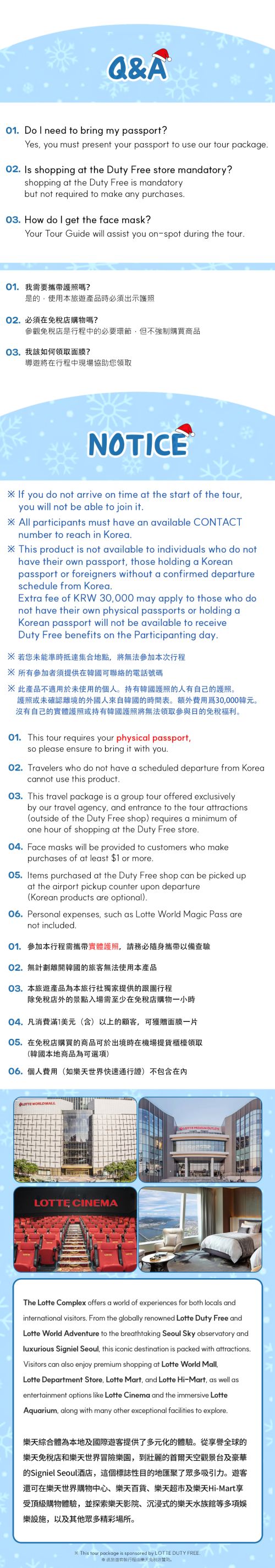 ▲ ※ 只有在乐天免税店停留至少一小时方可提供门票。但购物(购买商品)并非强制要求。 ※ 购物并非强制。您可以选择不购物,我们不会强制任何消费。 ※ 所有顾客将在现场通过中英文被告知可继续自由浏览。