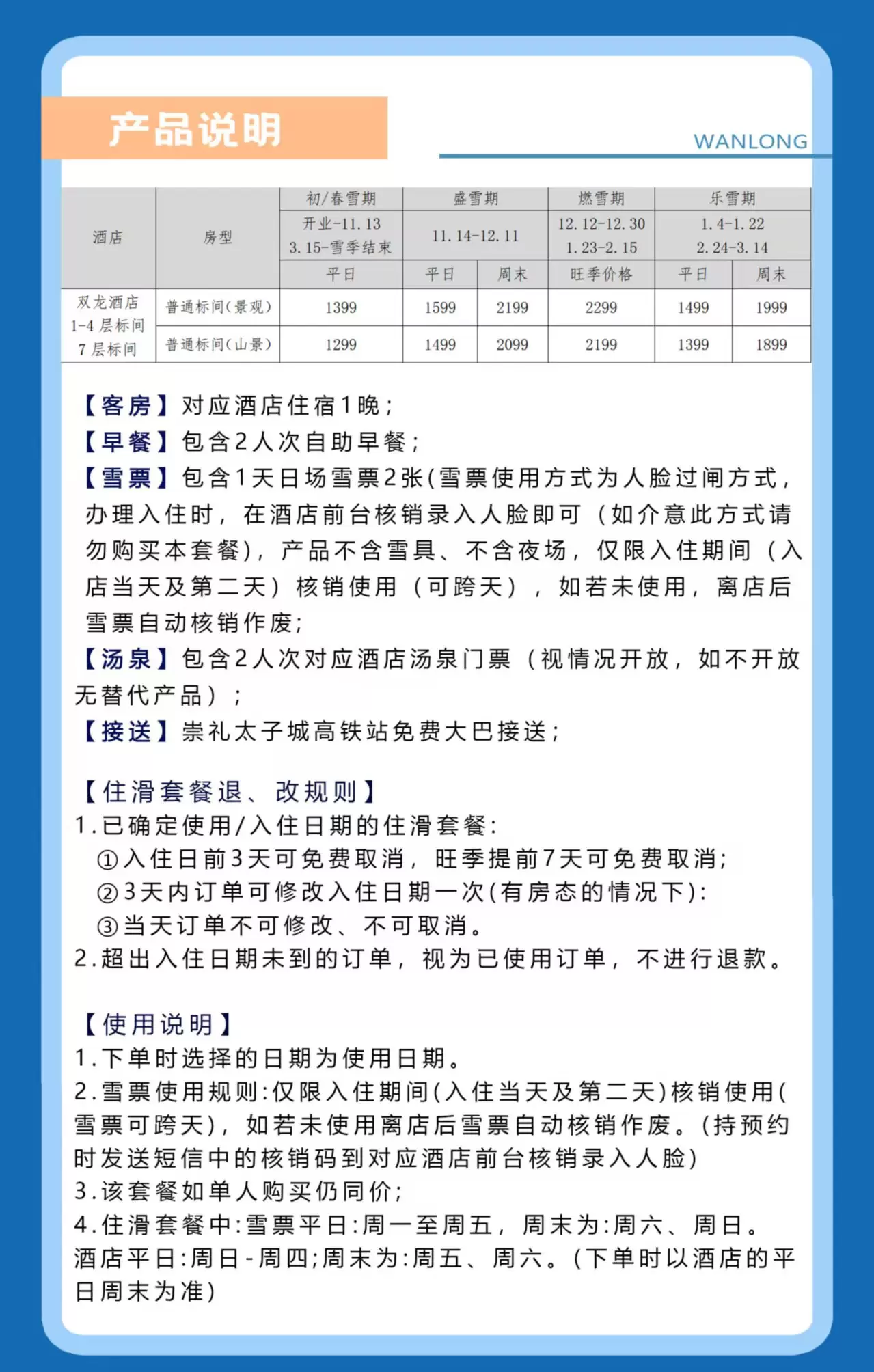 【滑进滑出】万龙滑雪场自营酒店1晚+2张万龙滑雪场1天日场自带板雪票+2张汤泉票+2份早餐+太子城高铁站接驳车