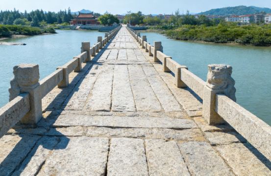 ▲ 安平桥,地处晋江市安海镇与南安市水头镇交界的海湾上,桥东起兴安路,上跨安海湾,西至水头街,桥体为东西走向,共有石砌桥墩 361 座,有长方形、单尖船形、双尖船形等式样。桥墩之间横架巨型石板作为桥面。桥上及周边建有瑞光塔、桥头亭、水心亭、海潮庵等附属建筑。