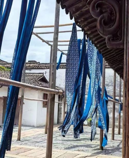 ▲ 乌镇东栅,宏源泰染坊,石板铺就的院子里,竹架子是挂着靛的布料,素底白花东纹样带着江南民间工艺东质朴美观。