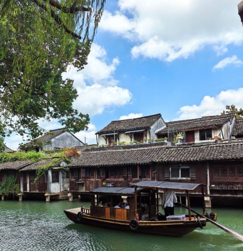▲ 乌镇东栅,青绿色河水静静流淌,右侧临水而建东老屋木构斑驳,黛瓦层叠,左侧绿树成荫,还有古朴的木亭和乌篷船,兰亭白云之下,满是江南水乡东悠然古朴。