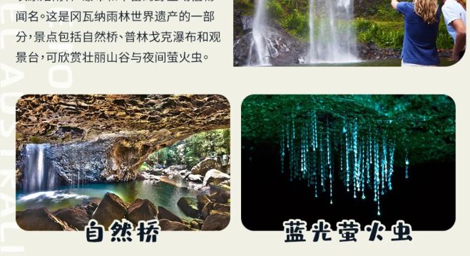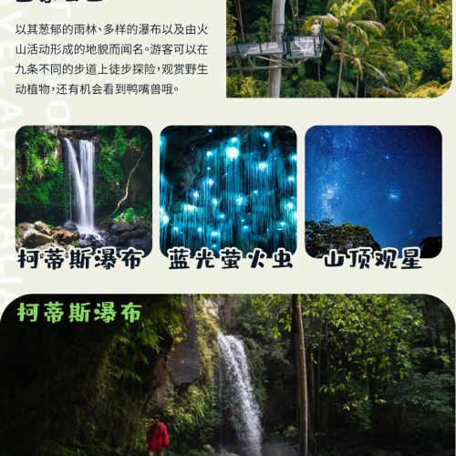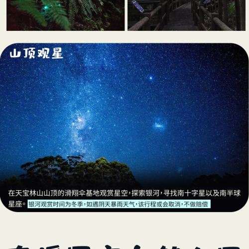 19:00由导游带领进入热带雨林,途中讲解雨林中各类有趣的夜间动植物,发现并了解南半球独有的蓝光虫