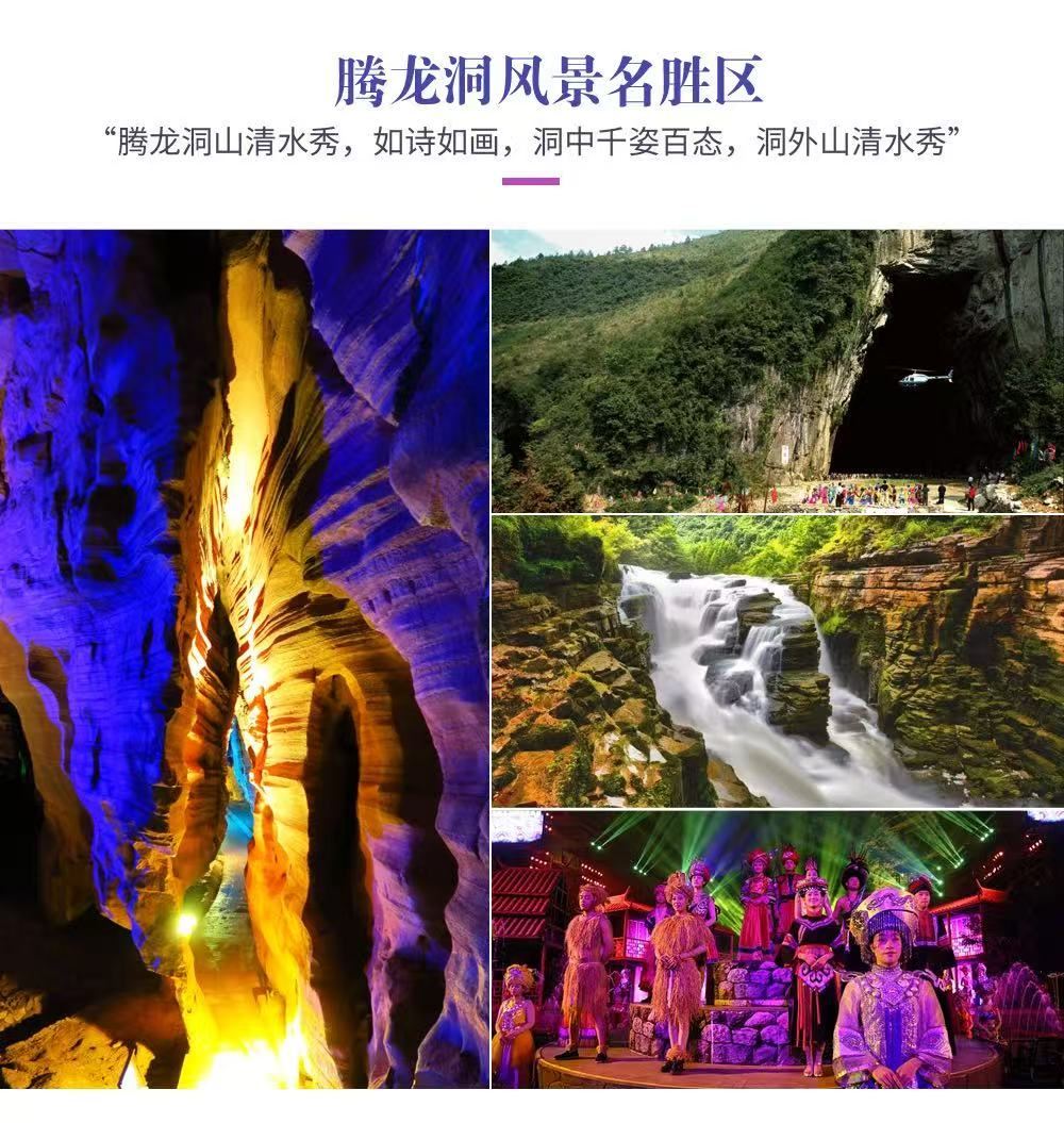 腾龙洞系特 级溶洞之一,中国大溶洞。该洞以其雄、险、奇、幽、绝的魅力。 该洞洞口高72米,宽64米,洞内最高处235米,初步探明洞穴总长度59.8公里,其中水洞伏流16.8公里,洞穴容积总量4000多万立方米。洞中有5座山峰,10个大厅,地下瀑布10余处,洞内终年恒温14一18℃, 空气流畅。洞中景观千姿百态,神秘莫测。洞外风光山清水秀,水洞口的卧龙吞江瀑布落差20余米,吼声如雷,气势磅礴。