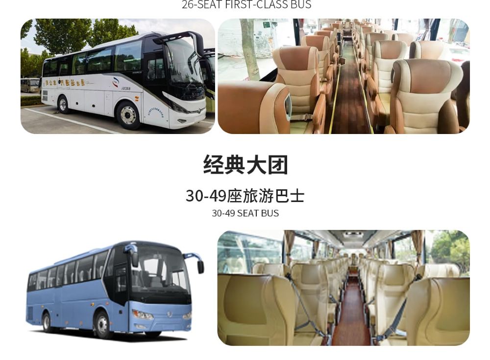 使用30-49座的大巴车,高性价比,大空间行李舱,配置空气悬挂,更舒适