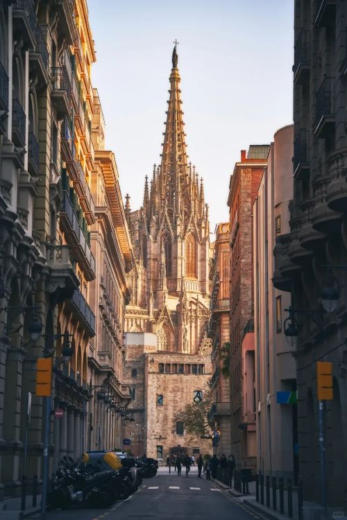 ▲ 沿着狭长街道远望巴塞罗那大教堂,高耸的哥特式尖塔在城市间浮现,是老城震撼的精神象征。