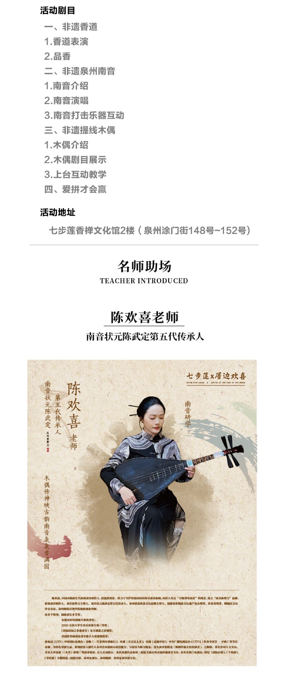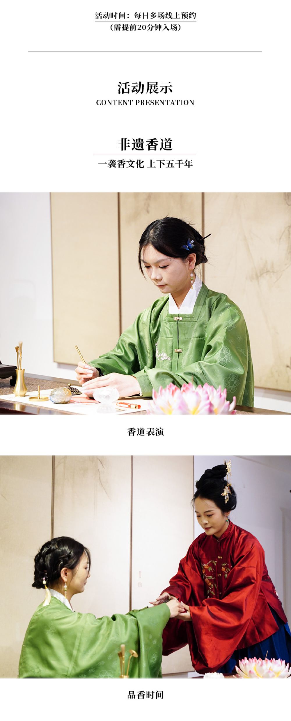 ▲ 1:到现场出示姓名或者手机号码即可 2:活动开始时间为15:30,活动开场前20分钟开始检票,无固定位置,按检票顺序入座。 3:自行前往活动地址七步莲香禅文化馆2楼(泉州涂门街148号~152号) 4:整场活动时间为45分钟。