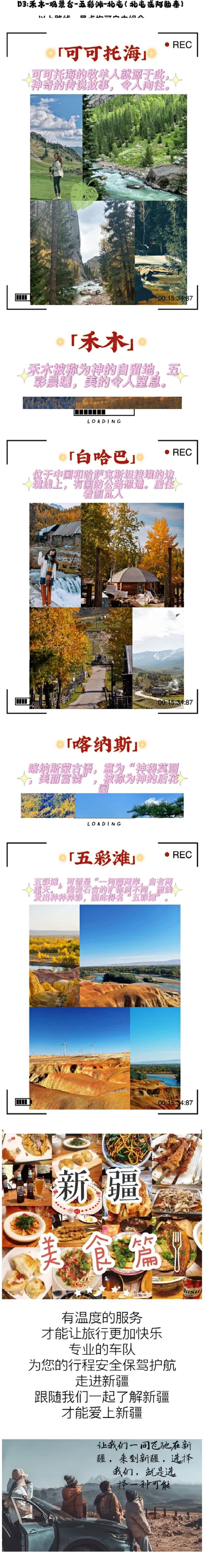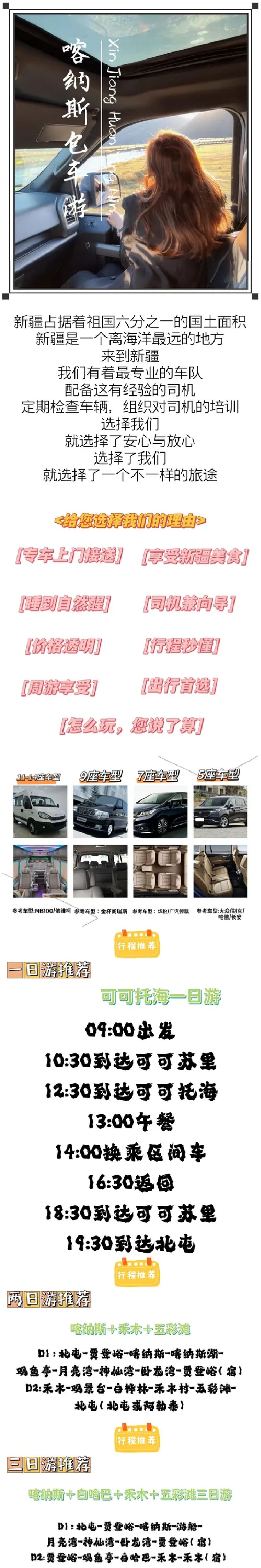 本产品套餐可可托海是一天行程,喀纳斯+禾木属于两天行程,因为山路上有区间测速,按照交通局规定单程需要行驶4四小时,喀纳斯+禾木+五彩滩+白哈巴属于三天行程车费按照三天来计算的,更多详细行程请咨询客服。