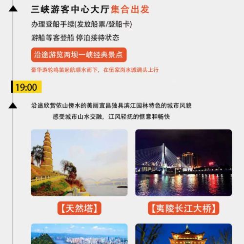 18:00-19:00左右至三峡游客中心登船,19:20停止检票,冬季开船时间会提前19:00停止检票,敬请知悉!