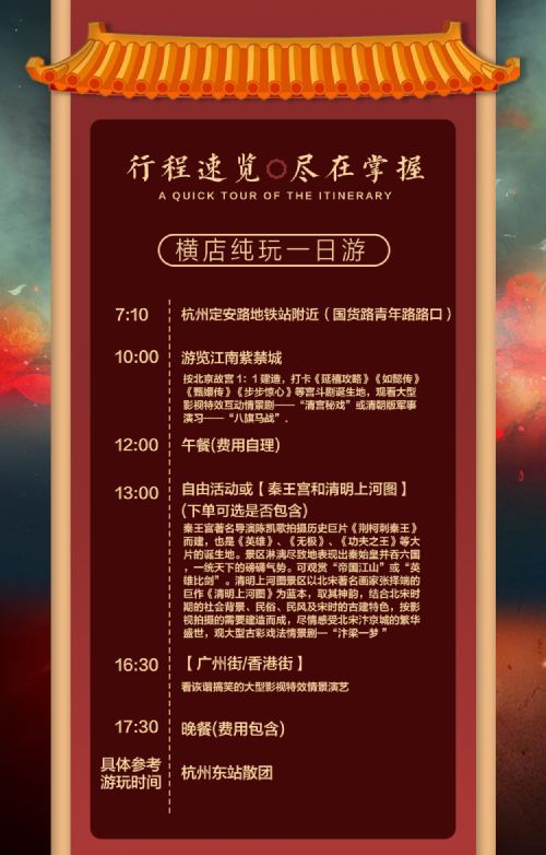 横店影视城一日游【明清宫·秦王宫·广州街香港街·清明上河图】【高品纯玩无购物,纯玩天天发,市区内上门接客;】