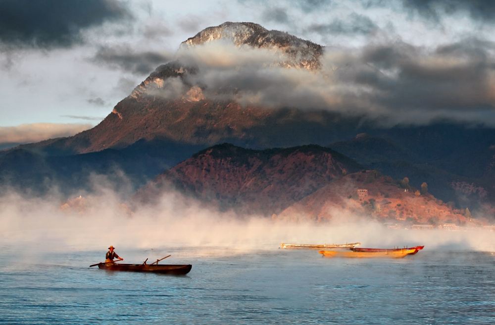▲ 云雾缭绕的山峦下,泸沽湖晨雾弥漫,小舟轻荡,渔人独钓,如诗如画的静谧仙境。