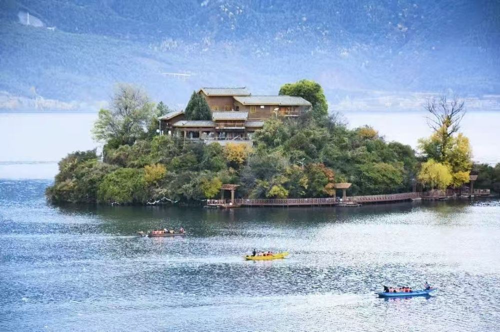 ▲ 湖中小岛林木斑斓,屋舍雅致,游船穿梭,远山如黛,一幅灵动的山水人文画卷。