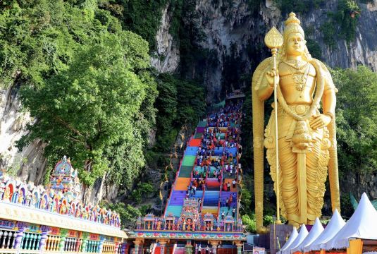 ▲ 黑风洞 登上272级色彩斑斓的彩虹阶梯,沿途有高达42.7米的姆鲁甘神黄金雕像守护。这座石灰岩奇观内藏古老的洞穴寺庙,将令人屏息的精神氛围与探险趣味完美融合。攀爬途中,别忘了留意在石灰岩峭壁间嬉戏的野生猴群。