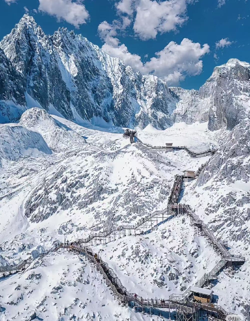 ▲ 只有乘坐玉龙雪山冰川大索道,才能抵达海拔4680米的观景平台哦!此处海拔较高,建议您根据自身情况谨慎选择是否前往。”