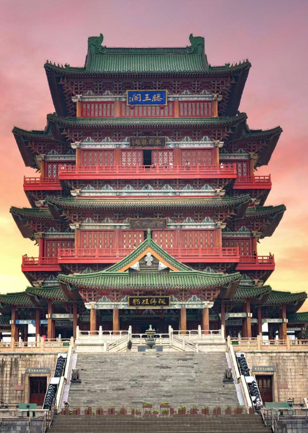 ▲ 滕王阁,江南三大名楼之一 ,位于江西省南昌市西北部沿江路赣江东岸,始建于唐朝永徽四年,因唐太宗李世民之弟——李元婴始建而得名,因初唐诗人王勃诗句“落霞与孤鹜齐飞,秋水共长天一色”而流芳后世。贞观年间,唐高祖李渊之子、唐太宗李世民之弟李元婴曾被封于山东滕州故为滕王,且于滕州筑一阁楼名以“滕王阁”(已被毁),后滕王李元婴调任江南洪州(今江西南昌),因思念故地滕州修筑了著名的“滕王阁”,此阁因王勃一首《滕王阁序》为后人熟知,成为永世的经典。 滕王阁与湖北武汉黄鹤楼、湖南岳阳楼并称为“江南三大名楼”。历