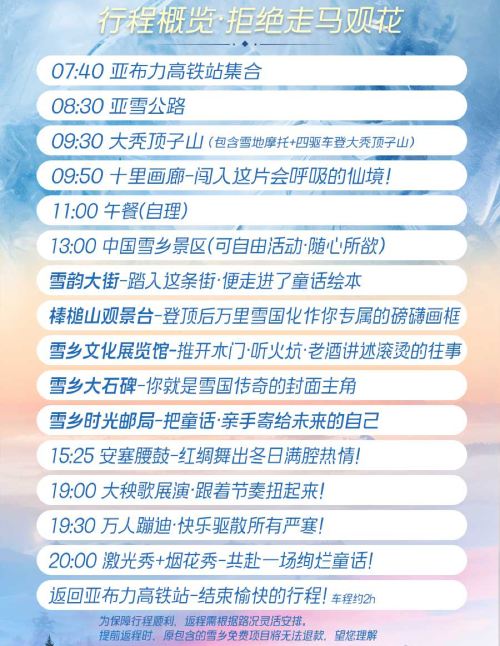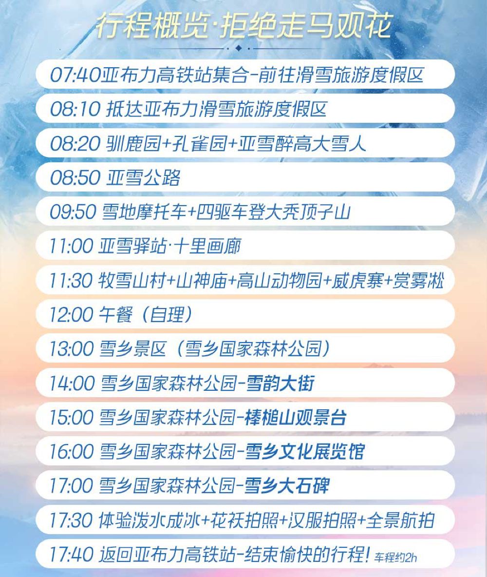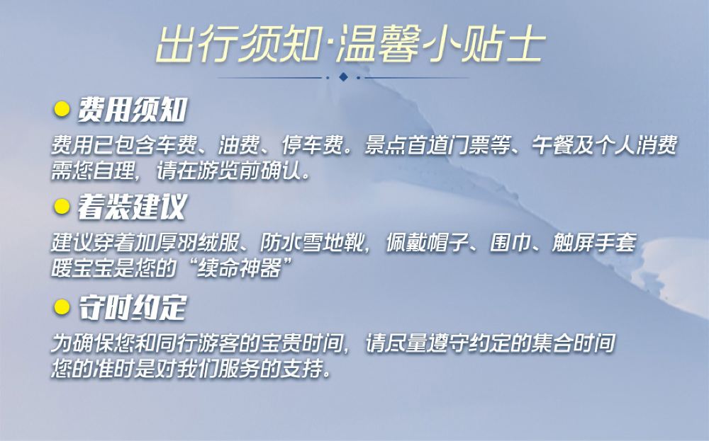·行程时间可能因天气、路况微调,请配合导游安排,确保行程顺利。