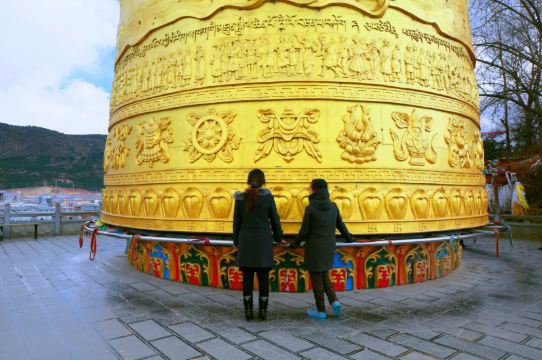 ▲ ▲ 巨型转经筒是位于海拔3300米的云南省迪庆藏族自治州香格里拉市独克宗古城大佛寺山坡上的大型宗教设施,已载入吉尼斯纪录。 转经筒高21米,总重60吨,筒身为纯铜镀金,筒顶上有直径较大的伞盖。 筒内装藏有经咒、六字真言124万条及多种佛宝共16吨。 转经筒轮座采用滚珠轴承,外围设有不锈钢管弯成的环,环上固定布条带以供多人拉动转动,通常需四五人合力操作!