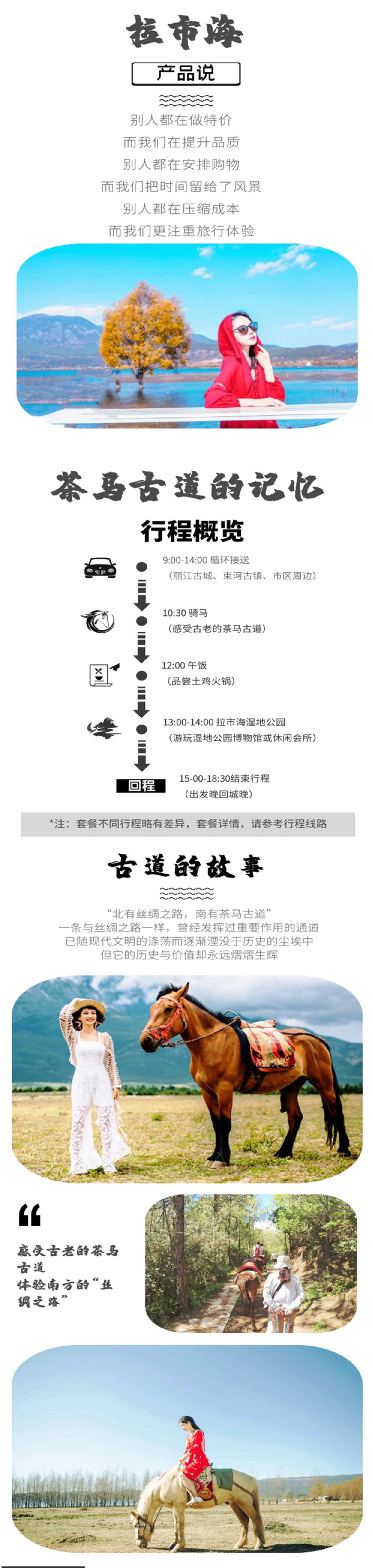 丽江拉市海骑马湿地公园+千古情门票纯玩一日游【可选划船】【当天可定9-14点每小时一班车循环接送,拉市海茶马古道骑马60-90分钟,】