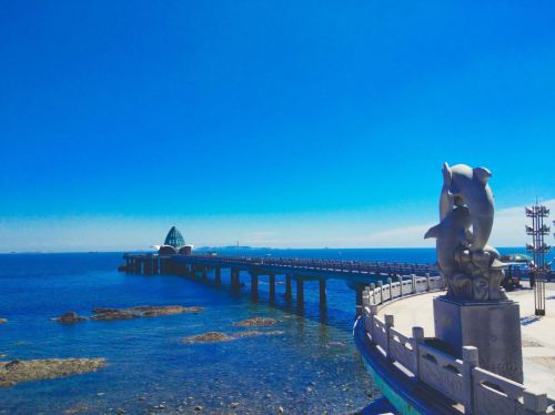 ▲ 依山势建就的东山宾馆,有“烟台国宾馆”之称。出东山宾馆后门,一条海滨路之隔就是那巨龙探海般的栈桥了,形若一把“吉它”,尽端是“荷花瓣”的竞海广场。栈桥的一个特色是直桥桥面设置透明桥面,游人可在桥上饱览脚下的惊涛骇浪,为“海上看烟台”的重要观景点。