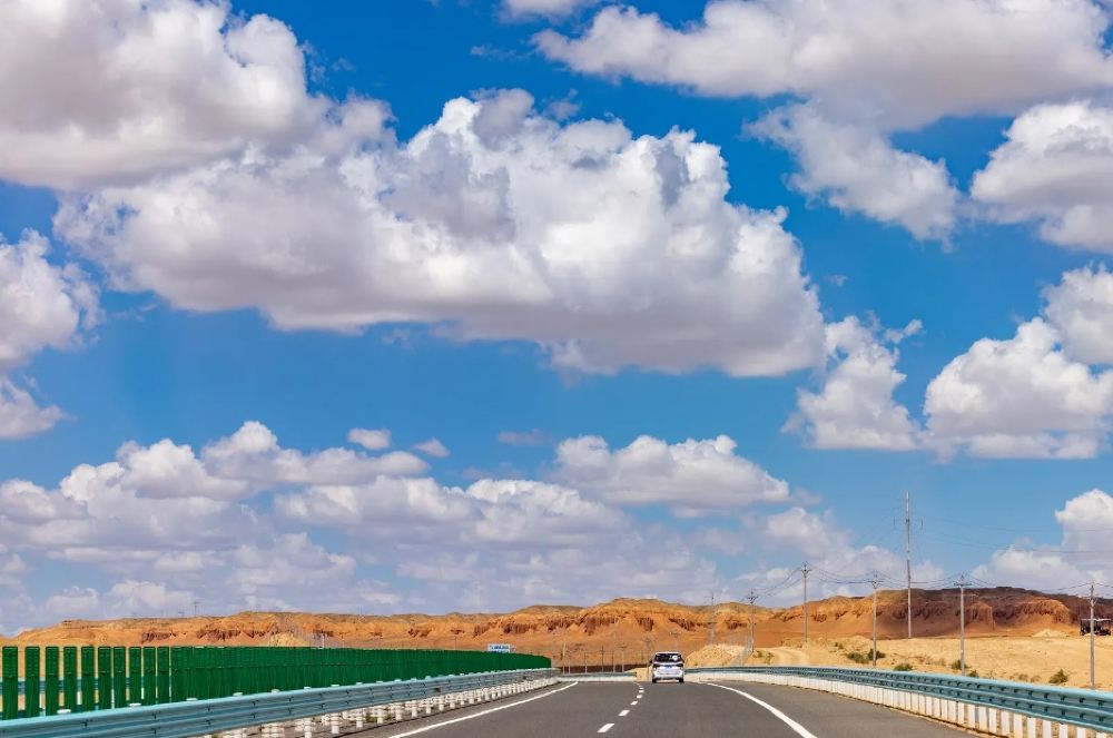 ▲ 旅途亮点: 沿途可欣赏到独特的沙漠景观,如雅丹地貌、湿地等,还能看到野骆驼等野生动物,仿佛置身于一幅壮丽的画卷。 公路设有5对服务区,每个服务区都有独特的设计和主题,如军垦文化、旅游探险、野生动物保护等,提供加油站、餐厅、卫生间、充电桩等服务。 驰骋这条“黄金之路”,感受大漠孤烟与现代工程的震撼交响!