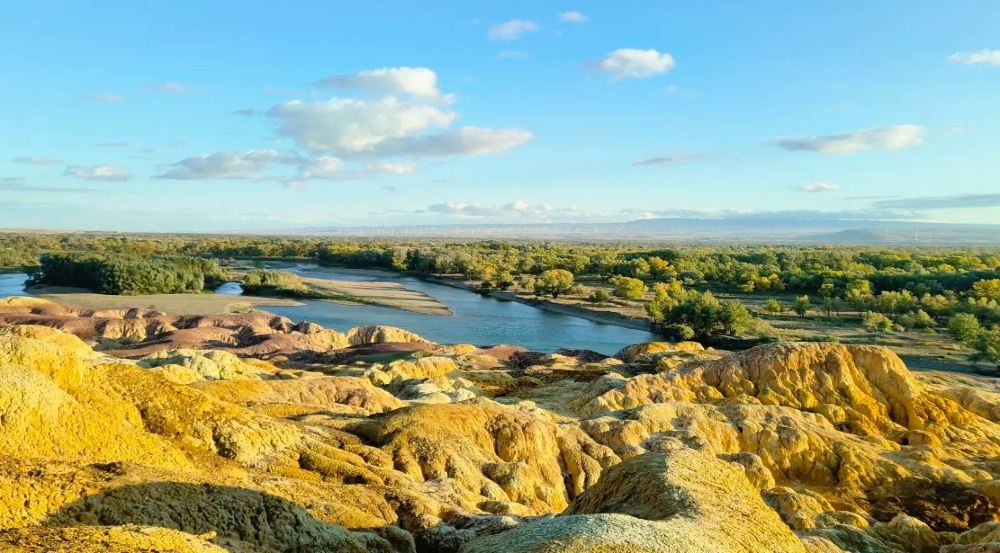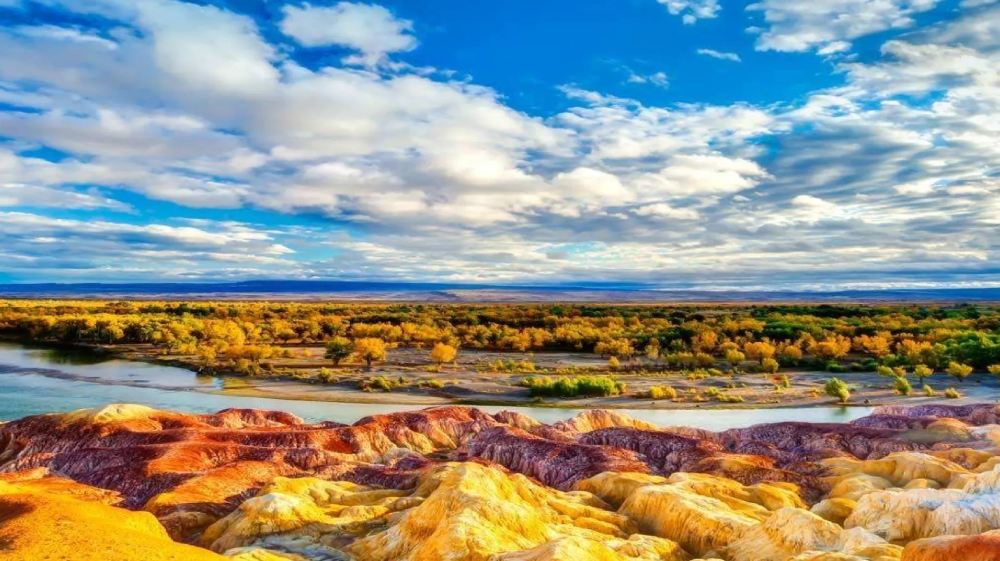 ▲ 新疆五彩滩位于布尔津县城西北24公里处。它以其独特的雅丹地貌和绚丽的色彩而闻名,被誉为“上帝打翻的调色盘”。额尔齐斯河从其旁流过,形成“一河隔两岸,自有两重天”的奇景,北岸是五彩斑斓的雅丹,南岸是葱郁的河谷森林与沙漠。