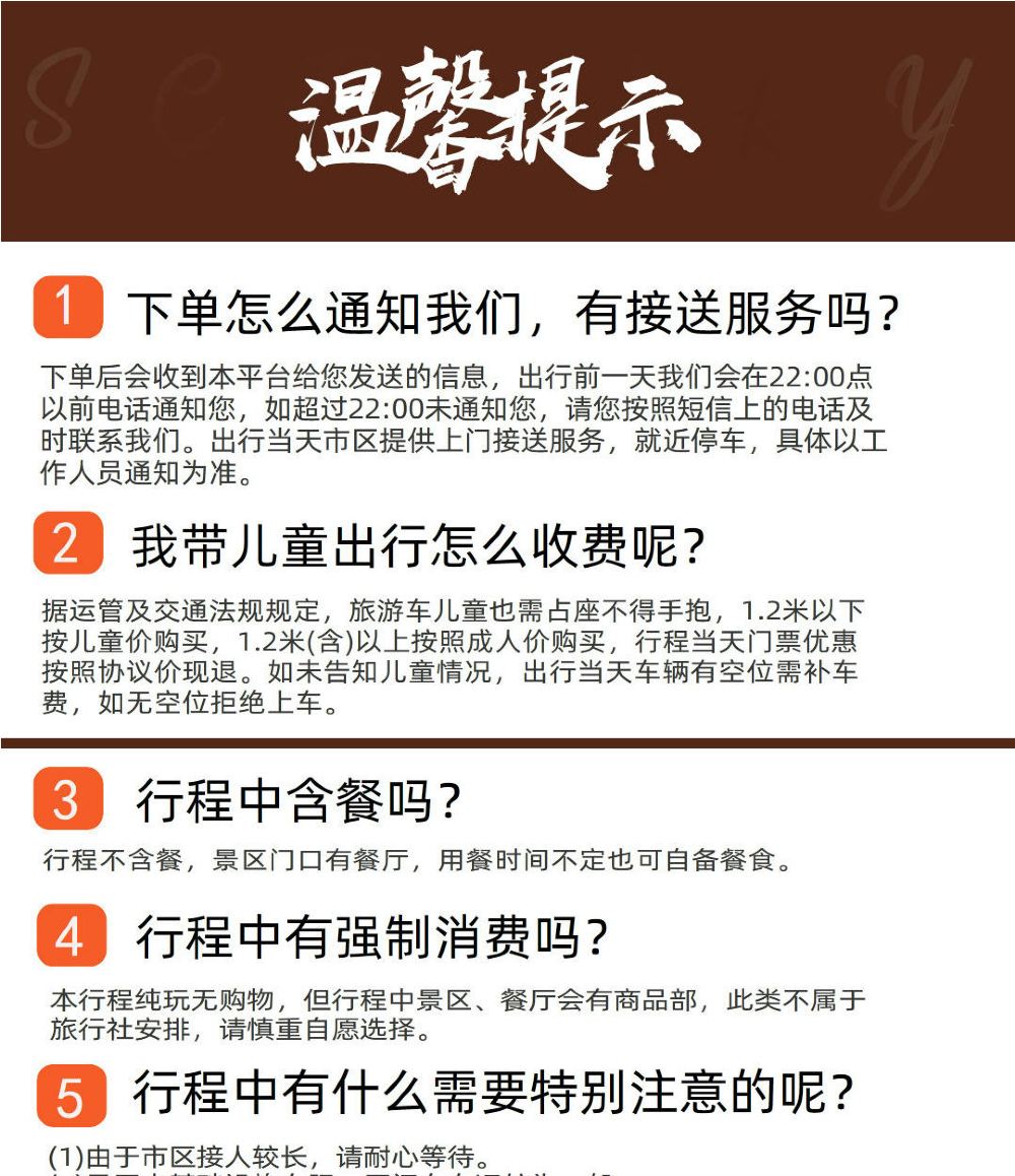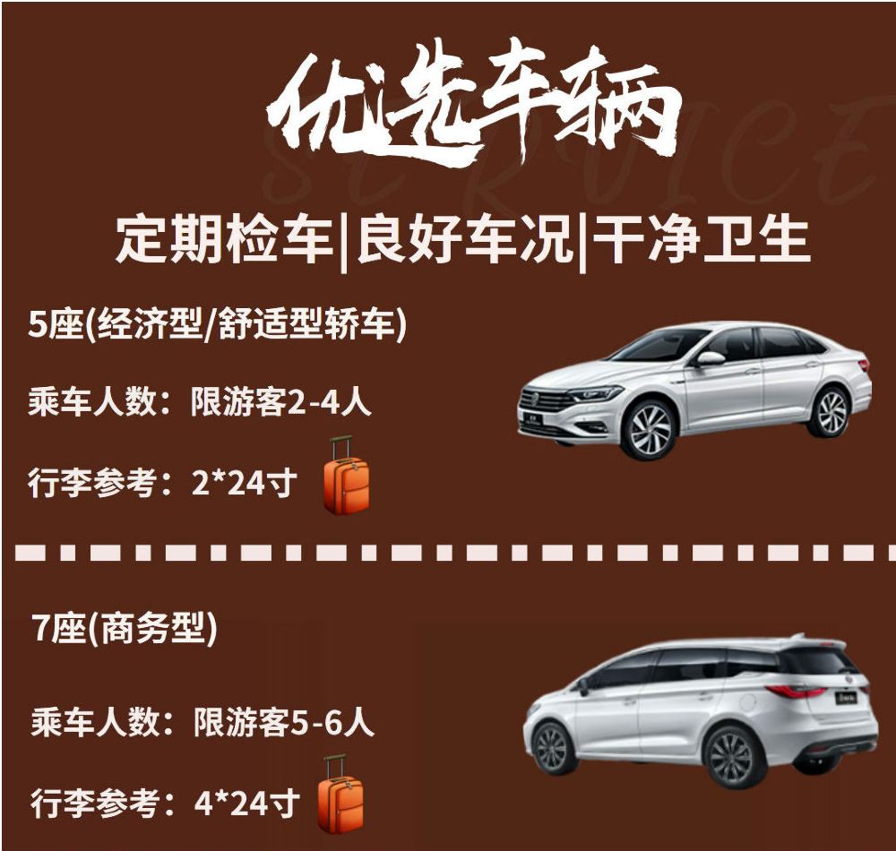 3、车辆安排:根据人数订车辆,保证一人一正座。注:1-4人五座轿车;5-6人七座商务车