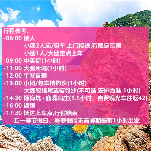 行程:接人-中英街-大鹏古城-杨梅坑+鹿嘴山庄-小团包车桔钓沙/大团桔钓沙或较场尾不可选-返回