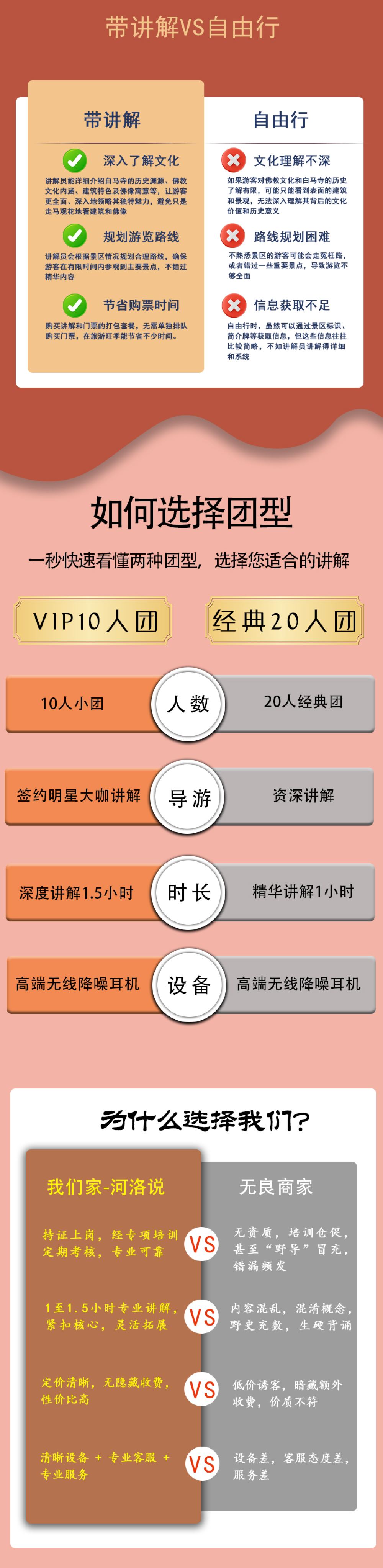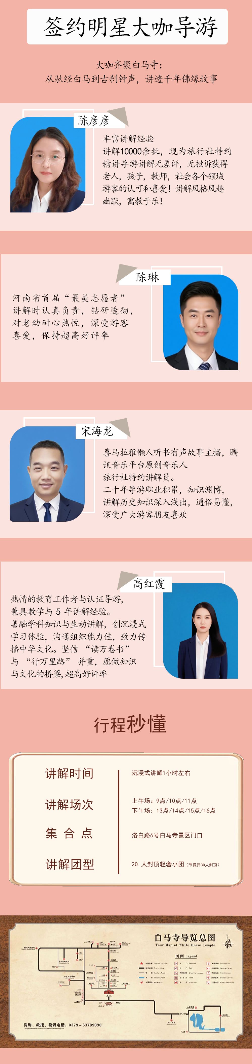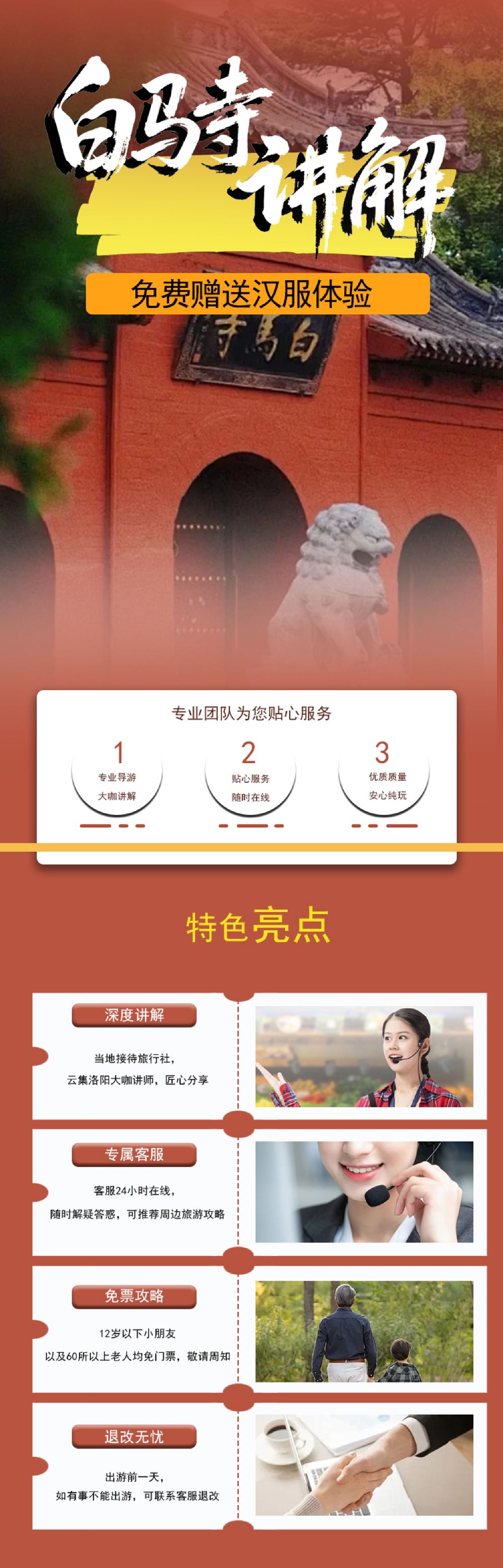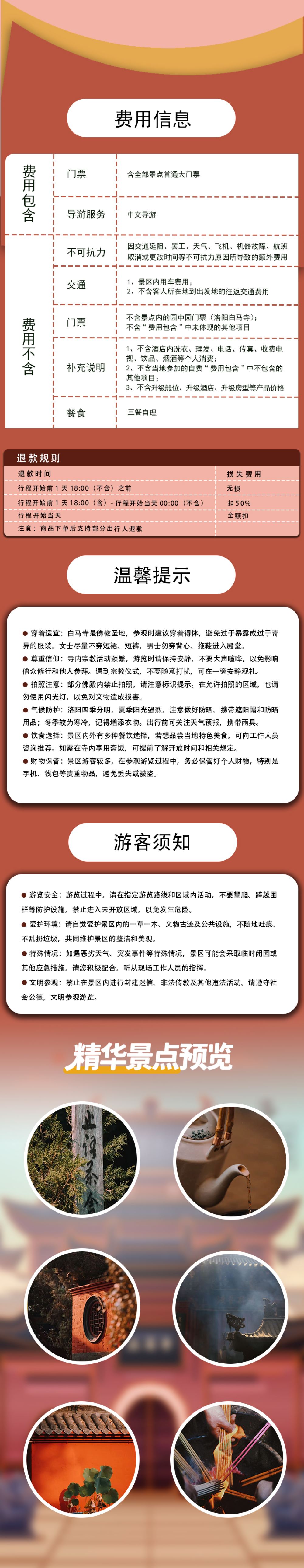 1.导游会提前一天晚上通过短信或电话的方式与您联系,每天场次下:9:00 10:0014:00,由于是散客拼团请在您下单时间的场次提前10分钟到达白马寺检票口集合,迟到20分钟以上视为放弃跟团,自行游览,不退任何费用,敬请谅解!