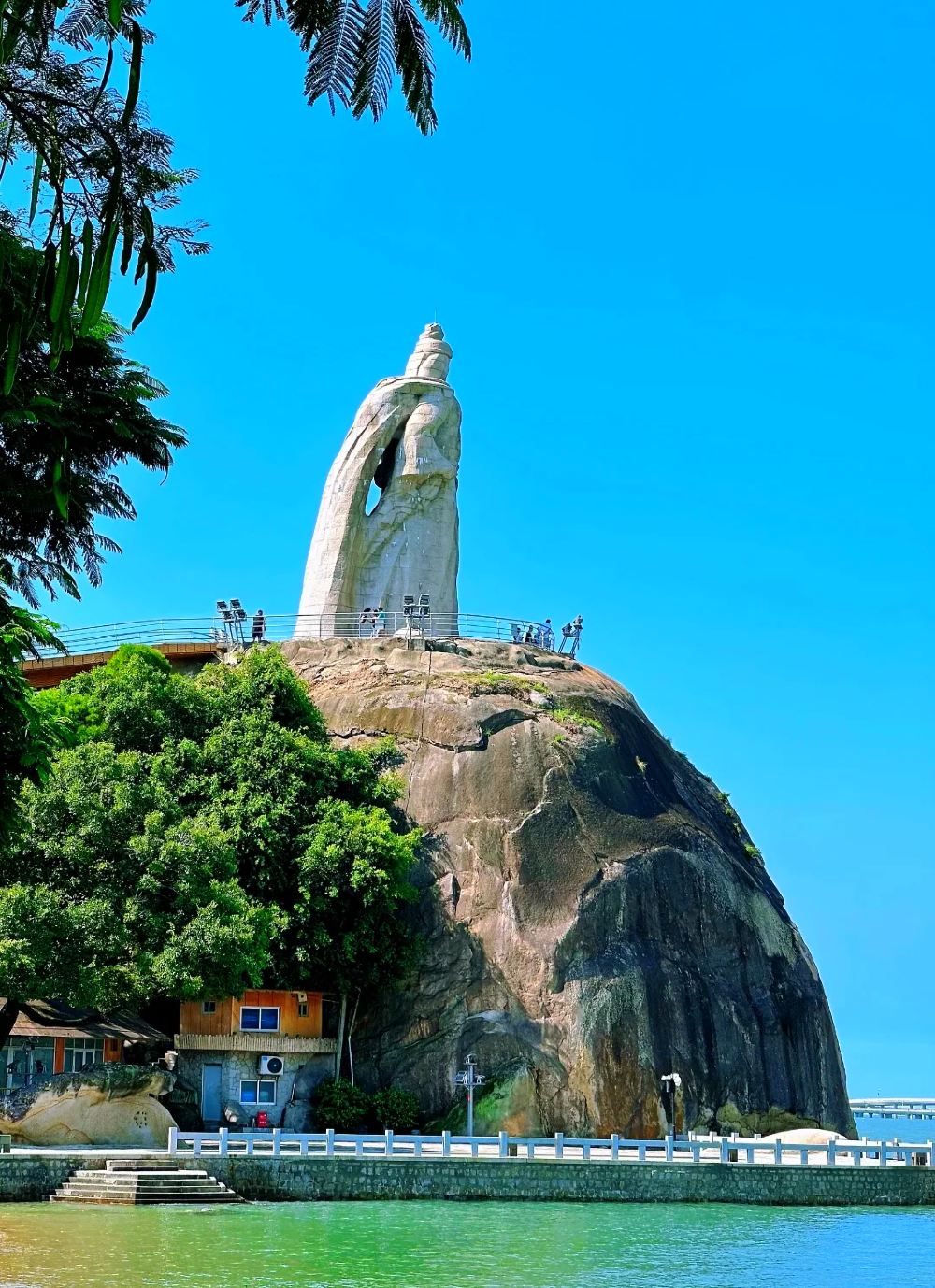 ▲ 郑成功雕像雕于1985年8月27日郑成功诞辰361周年落成,屹立在鼓浪屿东南端的覆鼎岩。覆鼎岩高24米,三面临海,一面与鼓浪屿接壤。高15.7米,宽9.2米,重1400多吨,由625块白花岗雕凿嵌接而成。
